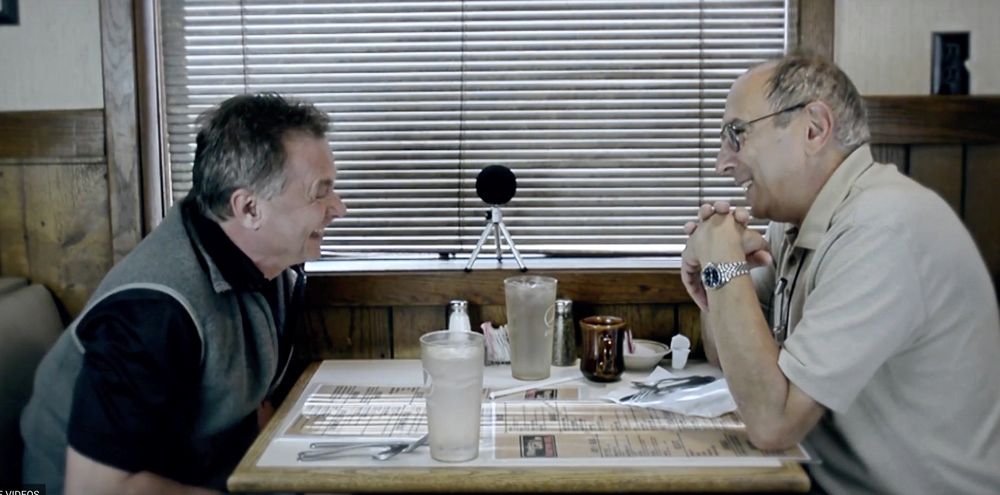 Épisode huit des astronomes en bordure de route. Une scène de la star de la série Web documentaire où Scott Roberts s'assoit avec le tristement célèbre David Levy.